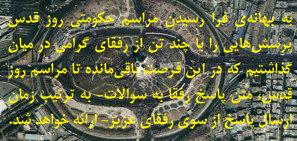 سال گذشته دربارهی حضور یا عدم حضور در این مراسمات که البته در جهت اعلام مخالفت با رژیم بود اختلافاتی میان نیروهای اپوزیسیون وجود داشت و به طور مشخص نیروهای چپ هم موضع گیریِ چندان روشنی نداشتند. اکنون اما مبارزات خیابانی فروکش کرده و در صورتی که اصلاحطلبان بخواهند برخلاف مراسم 22خرداد مردم را برای حضور در تظاهرات روز قدس دعوت بکنند به نظر میرسد فرصت خوبی برای شعلهور کردن مبارزات مردم علیه رژیم جمهوریاسلامی باشد. حال با این مقدمهای که خدمتتان ارائه شد ما دو سوال از شما رفیق گرامی داریم:
