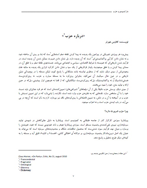 *مقالهی «دربارهی حزب» نوشتهی کلاوس هورنر به نقل از کتاب: «مارکسیسم و حزب» نوشتهی جان مالینوکس، منتشر شده در سایت هفته