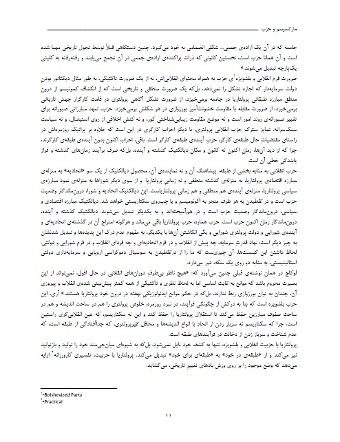 حزب، اما، يك ظرف صرف، يك پديدهي فراتاريخي نيست. حزب يك ضرورت تاريخيست، بنا بر اين، بايد در متن تعيينات تاريخي و در صيروريتاش در نظر گرفته شود. براي تبين ديالكتيكي حزب خواننده را به مقالهي كوتا اما پرمحتواي كلاوس هورنر* ـ در بارهي حزب ـ كه در مقدمهي كتاب ماركسيسم و حزب نوشتهي جان مالينوكس آمده است مراجعه ميدهم. اين كتاب در سايت مجلهي هفته در دسترس است.